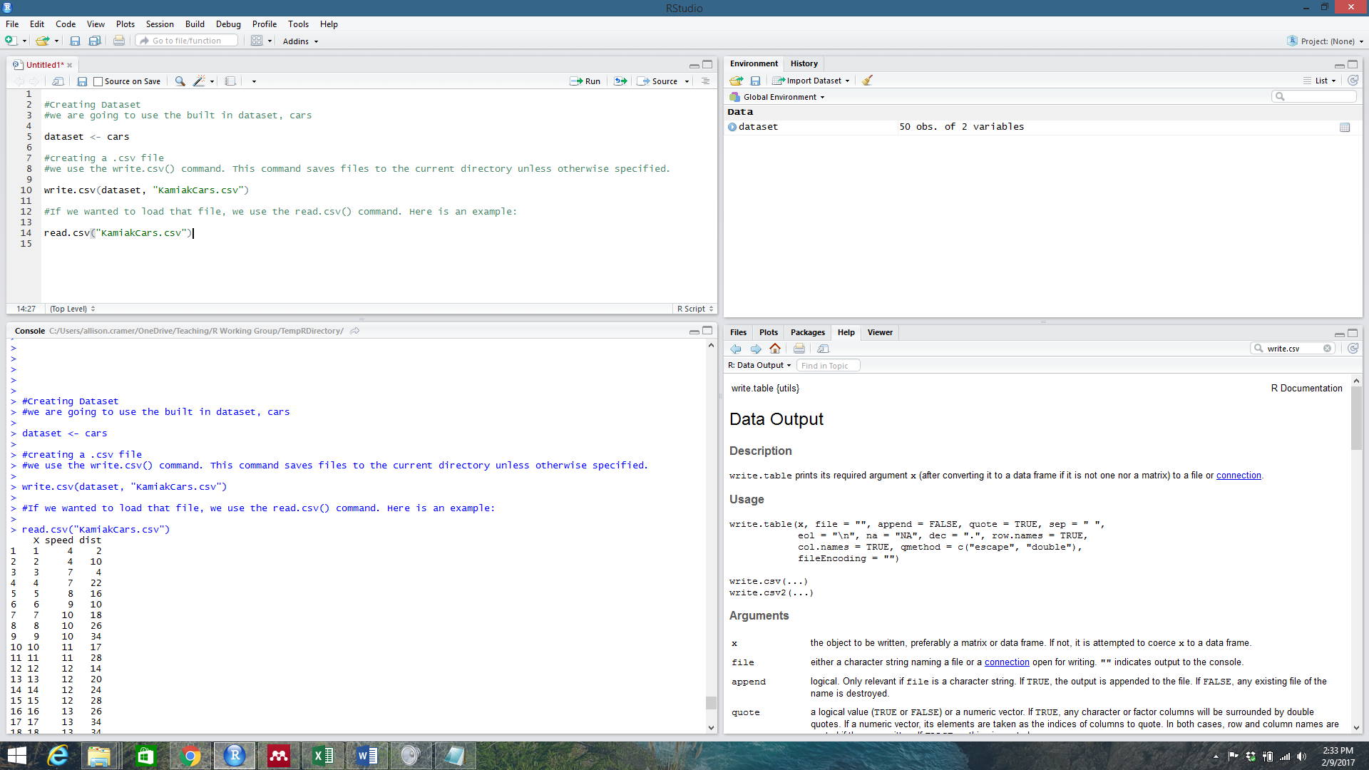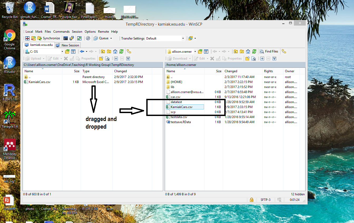 Here is an example of creating a .csv file in R, then moving it to Kamiak, on a Windows computer. Mac and Linux users will have similar experiences.